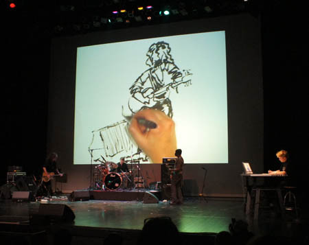 開幕式的起頭即以漫畫家現場作畫投影搭配搖滾樂團的演出,
